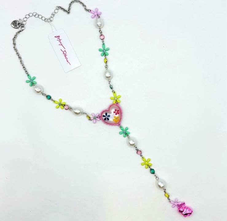 Refined chain y-shaped necklace featuring spring inspired charms including scalloped heart, colorful flowers, pearls and coordinating playful bunny. Adorned with stone accents. Necklace has an adjustable lobster clasp closure. Made from metal, glass crystal, plastic and imitation pearl.