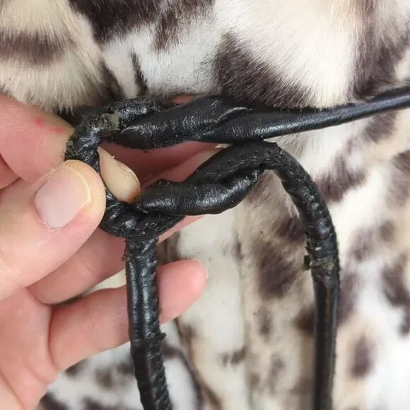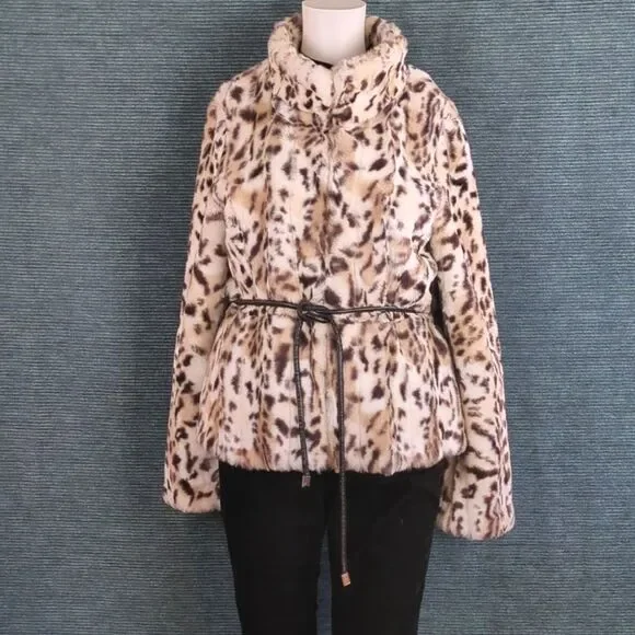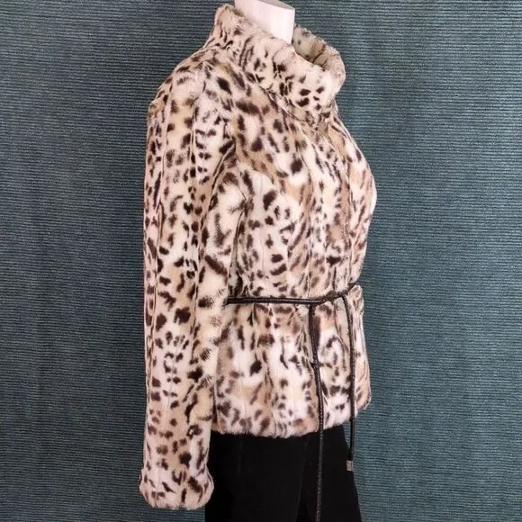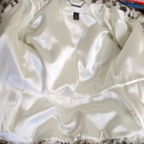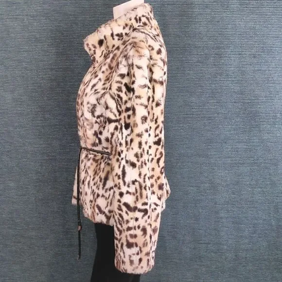 Super cute, vegan, faux fur coat by WHBM!It is a short boxy style with a peplum flare from the waist. The collar is a stand up collar to snuggle down into and keep your neck warm... It's not exactly a leopard print, because it doesn't have rosettes... I'm not sure exactly what type of fur it's supposed to be... The colors in it are light brown and dark brown (not quite black) on a cream background.White satin liningClosures are fabric covered hidden hook and eye. No pocketsIt comes with a soft, faux leather cord belt, but it should be replaced, see notes below. Armpit to armpit 19"Shoulder to shoulder in back 16" Length from shoulder 24"Sleeves 25"This beautiful coat is in excellent pre-owned condition, shows no wear.However, the belt did not hold up so well. it has a lot of wear and the surface is flaking off.I personally would wear it without the belt, or replace it with something similar. I'm selling it for my best friend, it's had one owner, not thrifted.